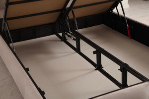 Grâce à son système de lit coffre relevable, vous accédez à un grand volume de rangement, idéal pour optimiser l’espace. Le mécanisme est soutenu par 4 vérins hydrauliques puissants, garantissant une ouverture facilitée, stable et sécurisée. Le caisson en métal assure une robustesse permettant de supporter une charge maximale totale de .