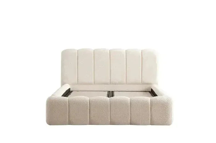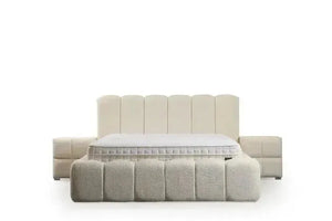 Le LIT EMIR se distingue par son élégant revêtement en tissu bouclettes. Ce matériau est non seulement doux au toucher et résistant, mais il apporte surtout une texture moderne et accueillante à la tête de lit, ajoutant une touche de sophistication à votre décoration.