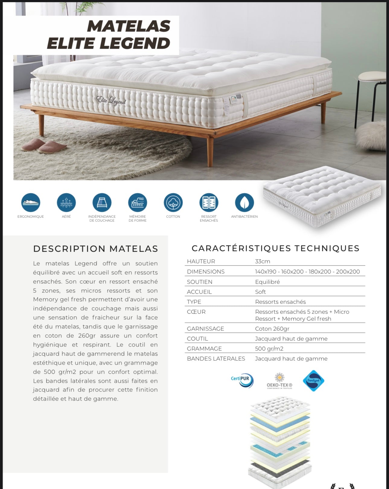 Avec une épaisseur totale d'environ , le cœur du Matelas Legend est l'alliance précise de trois technologies premium travaillant en synergie pour un confort équilibré (ni trop ferme, ni trop souple) :